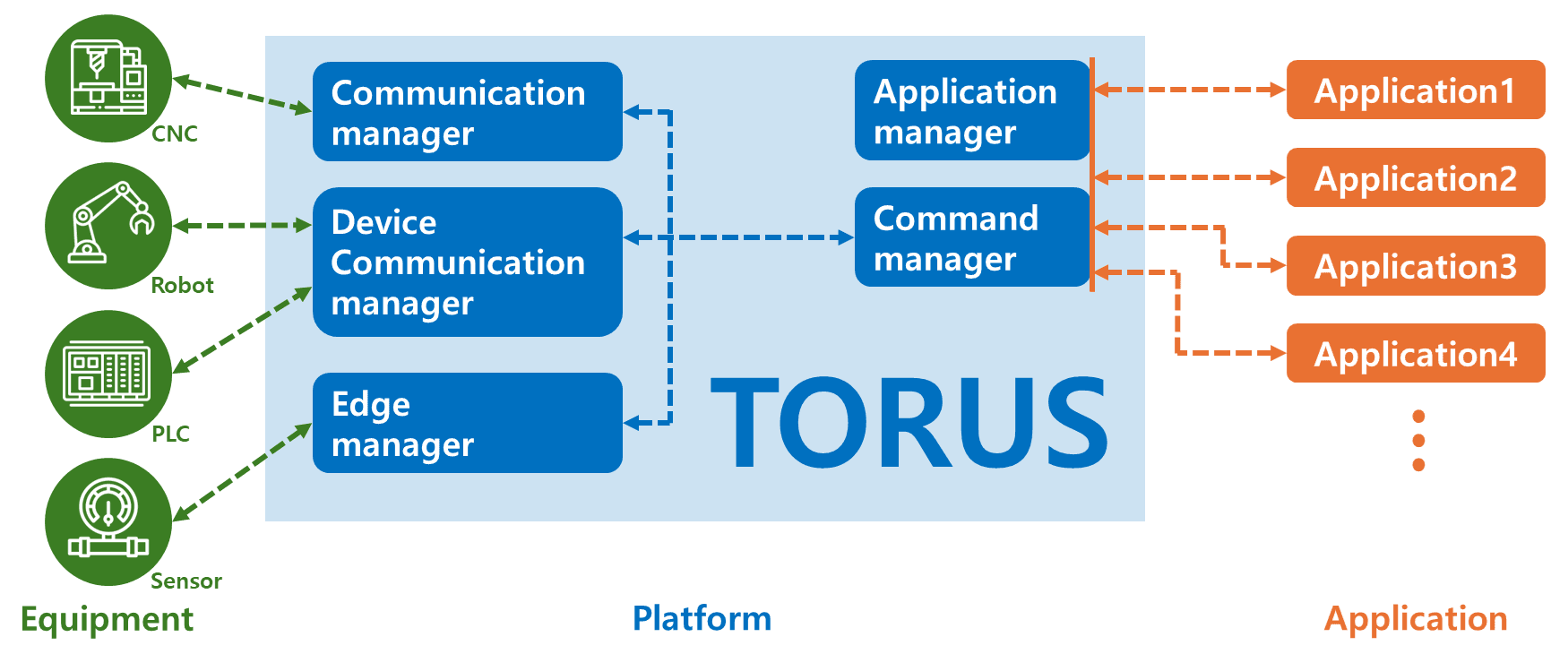 TORUS는 소프트웨어-설비 중개 플랫폼으로, 사용자 앱이 설비와 직접 통신하지 않고 플랫폼을 통해 통신합니다. 이로 인해 각 앱마다 별도의 설비 연결을 생성할 필요가 없으며, 설비의 연결 수 제한으로부터 자유로워집니다. TORUS는 설비와의 연결을 단일 지점에서 관리함으로써 연결을 정확하고 효율적으로 컨트롤할 수 있습니다. 이러한 통합 관리는 사용자에게 더 높은 안정성과 효율성을 제공합니다.