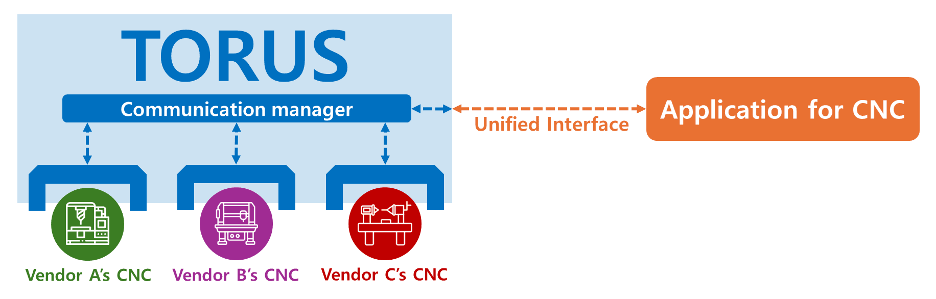 사용자 애플리케이션이 설비와 직접 통신하려면 해당 설비의 레거시 인터페이스를 사용해야 합니다. 하지만 TORUS에서 제공하는 통합 인터페이스를 사용하면 각 설비별 인터페이스를 구현할 필요가 없습니다. 이는 새로운 이기종 멀티벤더 설비가 추가되더라도 애플리케이션을 재개발할 필요가 없음을 의미합니다. 이러한 접근 방식은 시스템의 개발 및 유지보수 비용을 크게 절감시킵니다.
