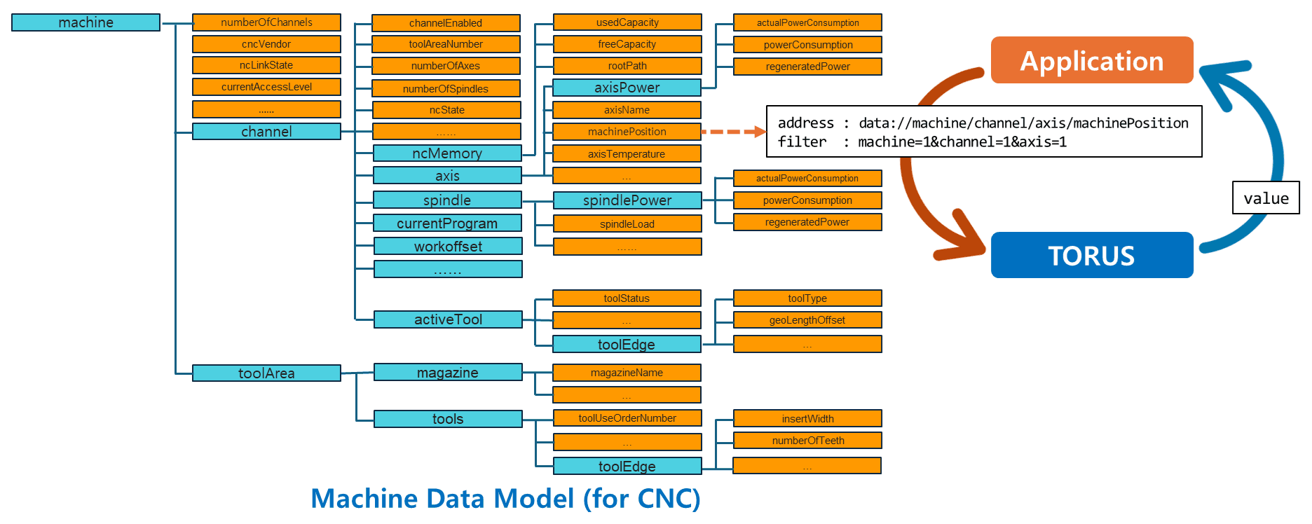 설비가 제공하는 상태값은 매우 다양합니다. TORUS는 설비의 상태값을 분류한 공통 데이터 모델을 제공하며, 이를 기반으로 URI 형식의 address와 filter를 이용해 원하는 상태값을 지정하여 획득하거나 수정할 수 있습니다. 이를 통해 복잡한 설비 상태값의 획득 및 수정이 보다 간편해집니다.